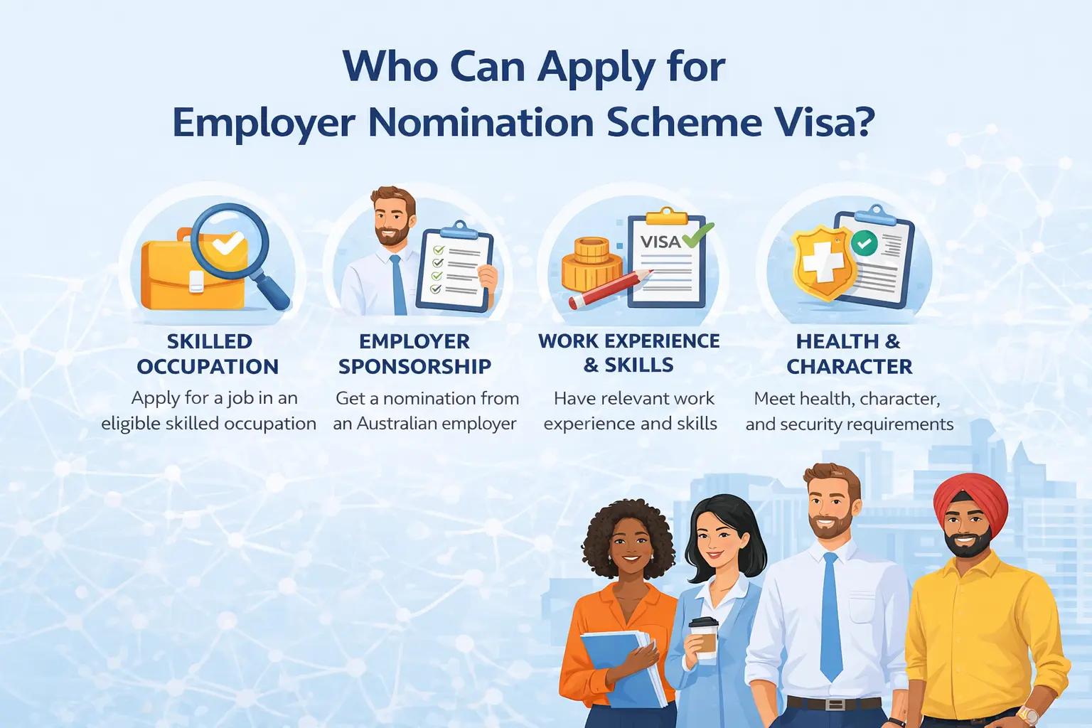 The Employer Nomination Scheme is open to skilled professionals who meet Australia’s eligibility criteria. Applicants are assessed based on their skills, qualifications, and work experience in occupations listed on Australia’s Skilled Occupation Lists.